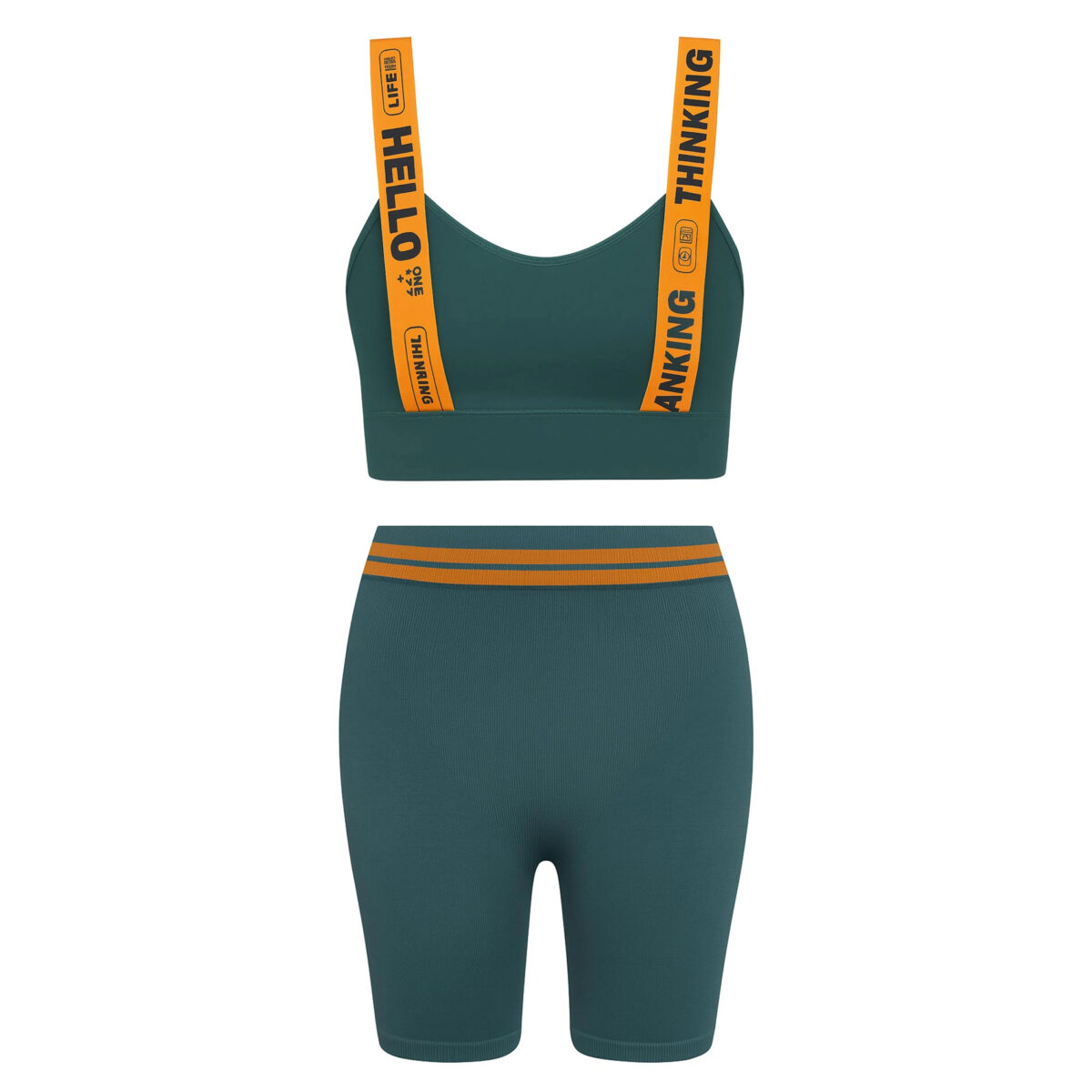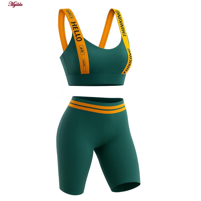 این ست ورزشی زنانه شامل نیم تنه و شلوارک در رنگ های مختلف با جزئیات نارنجی، طراحی مدرن و جذابی دارد که آن را برای استفاده روزمره و تمرینهای ورزشی مناسب میسازد. بندهای نارنجی رنگ تاپ با نوشتههای گرافیکی مشکی، ظاهری اسپرت و چشمنواز به آن بخشیدهاند. کمر شورتک نیز با دو خط نارنجی هماهنگ طراحی شده که جلوهای هماهنگ و زیبا ایجاد میکند.