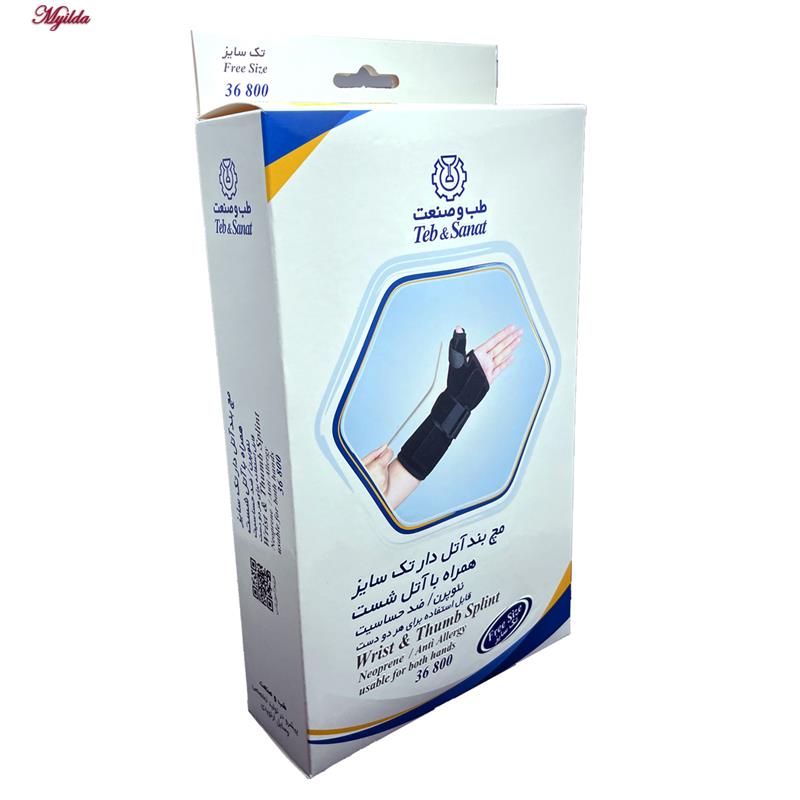 مچبند تک سایز طب و صنعت با استفاده از بهترین نوع نئوپرن وارداتی با پارچه ضد حساسیت تولید شده و علاوه بر ثابت نگه داشتن مچ دست در وضعیت خنثی (natural position) به دلیل وجود آتلهای صاف و منحنی در پشت و کف دست، دارای یک آتل آلومینیومی با قابلیت شکلپذیری است که موجب بیحرکتی و ثبات انگشت شست نیز میشود.