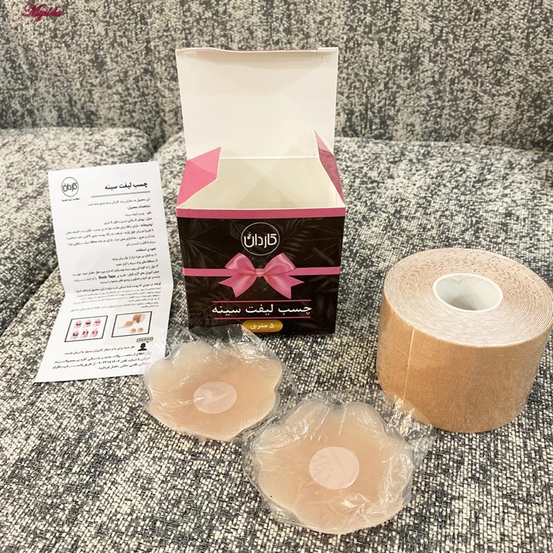 این چسب لیفت سینه با طول 5 متر و پهنای 5 سانتی متر می باشد و ماده ی تشکیل دهنده ی آن از 95 درصد پنبه و 5 درصد فیبر کشسان مصنوعی تهیه شده است. این ترکیب دارای منافذی است که هوا را به منافذ پوست که در زیر چسب قرار می گیرد می رساند و از تعرق پوست جلوگیری می کند. این بسته بندی دارای دو عدد محافظ سیلیکونی است که ضد حساسیت و قابل شست و شو است استحکام این نوار چسب بالاست و عرق کردن، شنا کردن و یا تکان خوردن های شدید منجر به جدا شدن چسب از بدن نمی شود. چسب لیفت بسیار کشسان است و تقریبا تا 2 برابر طول اولیه ی خود قابلیت کشیده شدن دارد و به هنگام استفاده از آن احساس نمی کنید که چیزی به بدن چسبیده است. جهت استفاده از چسب باید به اندازه ی مورد نیاز و متناسب با سایز سینه ی خود از آن برش بزنید و پس از هر بار استفاده آن را دور بیاندازید . نوار چسب به رنگ پوست می باشد و به راحتی نمی توان تفاوت آن با رنگ پوست را تشخیص داد. این ویژگی باعث می شود که بتوان از آن در زیر لباس های نازک، تاپ ها، لباس عروس ، لباس شنا و … استفاده کرد. این مدل چسب لیفت سینه می تواند حتی سنگین ترین سینه ها را به سمت بالا هل دهد و به آن ها فرم می دهد تا به فرم دلخواه خود برسید. از این چسب می توانید برای پوشاندن عضلات پا یا دیگر نقاط بدن هنگام تمرین نیز استفاده کنید.